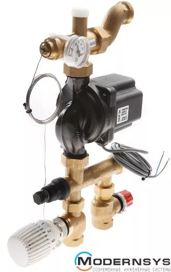 Насосно-смесительный узел предназначен для подключения контуров теплого пола к высокотемпературному контуру отопления. Оснащён термостатом (диапазон регулирования 20 - 55 °С) с дистанционным датчиком температуры потока, гидравлическим узлом смешивания потоков контуров подачи и возврата для получения необходимой температуры контура и балансировочным вентилем.