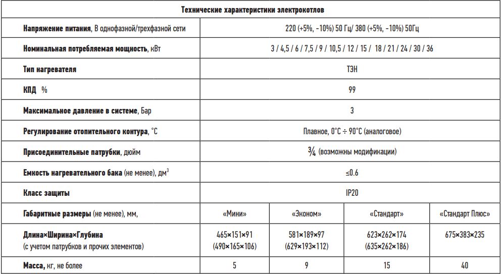 Технические характеристики для электрического котла Tenko Мини