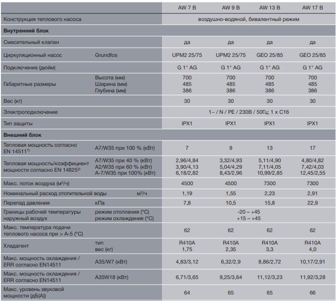 Технические характеристики для тепловых насосов Bosch Compress 7000i AW B