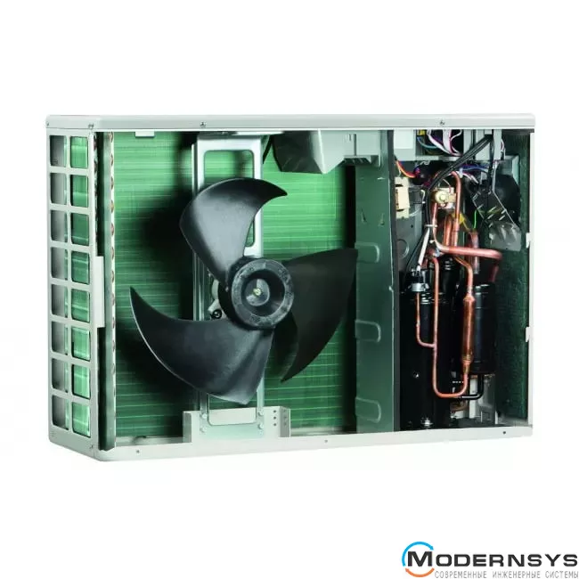 Внешний блок старших моделей имеет двух вентиляторные конструкцию и оснащен инверторным компрессором, работающим на хладагенте R410A. Самая низкая внешняя температура в режиме отопления также составляет минус 20С. Все тепловые насосы Magis PRO V2 могут работать как на обогрев в холодное время года так и на охлаждение помещений летом. Внутренний гидромодуль тепловых насосов Magis PRO V2 изготовлена в понятном форм-факторе настенного котла. Внутри гидромодуля смонтирован расширительный бак за ним находится теплообменник фреон / вода и коллектор. Снизу находится циркуляционный насос и трехходовой клапан. Управление тепловым насосом осуществляется с панели внутреннего блока.
