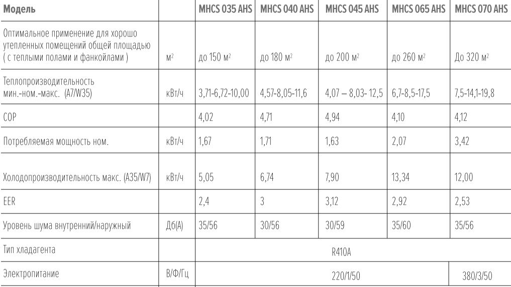 Технические характеристики для серии тепловых насосов MYCOND Arctic Home