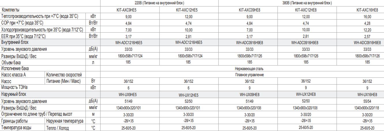 Технические характеристики для серии тепловых насосов Panasonic Aquarea T-CAP All in One