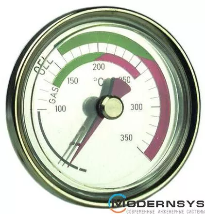 Приборы служат для контроля работы горелки в системах отопления, котлы которых используют в качестве топлива газ или мазут. Измерительным элементом выступает погружной стержень из нержавеющей стали марки 316 L. Подсоединение выполняется при помощи регулируемого конуса из латуни с диаметром от 8 до 12 мм. Корпус термометра изготовлен из оцинкованного листового металла и имеет диаметр 80 мм. Диапазон измеряемых температур от 0 до 500°C. Выпускаются модели с длиной погружного стержня 150 и 300 мм.