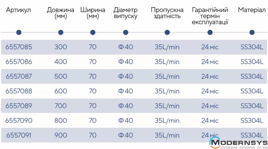Название товара КОД Монтажная длина (мм) Цена Трап душевой ASG 01E INOX SS304L DRY 900х70 0000767121 837 грн Трап душевой ASG 01E INOX SS304L DRY 600х70 0000767091 441 грн Трап душевой ASG 01E INOX SS304L DRY 300х70 0000767061 088 грн Трап душевой ASG 01E INOX SS304L DRY 700х70 0000767101 573 грн Трап душевой ASG 01E INOX SS304L DRY 400х70 0000767071 206 грн Трап душевой ASG 01E INOX SS304L DRY 500х70 0000767081 324 грн Трап душевой ASG 01E INOX SS304L DRY 800х70 0000767111 690 грн