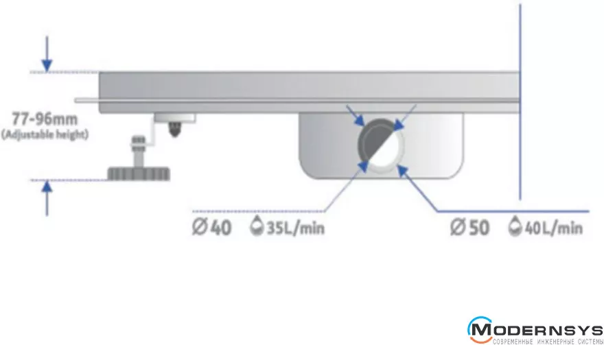 Трап также имеет продуманные регулируемые ножки с возможностью регулировки высоты от 77 до 96 мм, которые позволяют быстро и надежно выравнивать лоток в горизонтальной плоскости, обеспечивая устойчивость после установки.