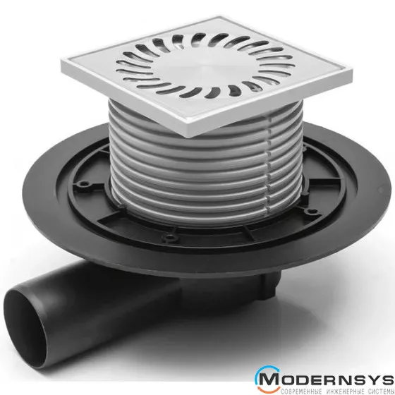Специальный фартук поможет укрепить гидроизоляционный слой на стыке трапа с бетонной стяжкой. При использовании рулонной гидроизоляции рекомендуем выбирать версию трапа с прижимным фланцем из нержавеющей стали. Благодаря двухкорпусные конструкции, высота трапа может регулироватьсяот 105 до 155 мм, или можно увеличивать монтажную высоту с помощью надставные элемента (арт. 389/9).
