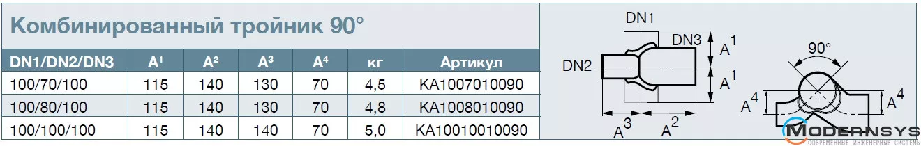 Технические характеристики: Тройник из чугуна SML 90* комбинированный DN100x100x100мм RSP (РСП) KA10010010090