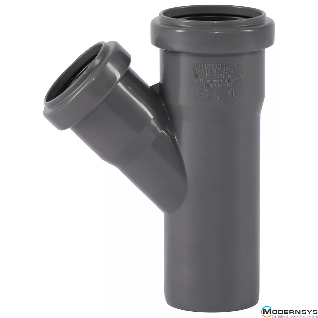 Тройник канализационный Ostendorf HT-Safe 50/40*45˚, Вид канализации: Внутренняя, Тип канализации: Простая, Градус (град.): 45, Модификация: 50/40х45, Цвет: Темно-серый, Диаметр (мм): 50, Материал: Полипропилен PPR, фото Тройник канализационный Ostendorf HT-Safe 50/40*45˚