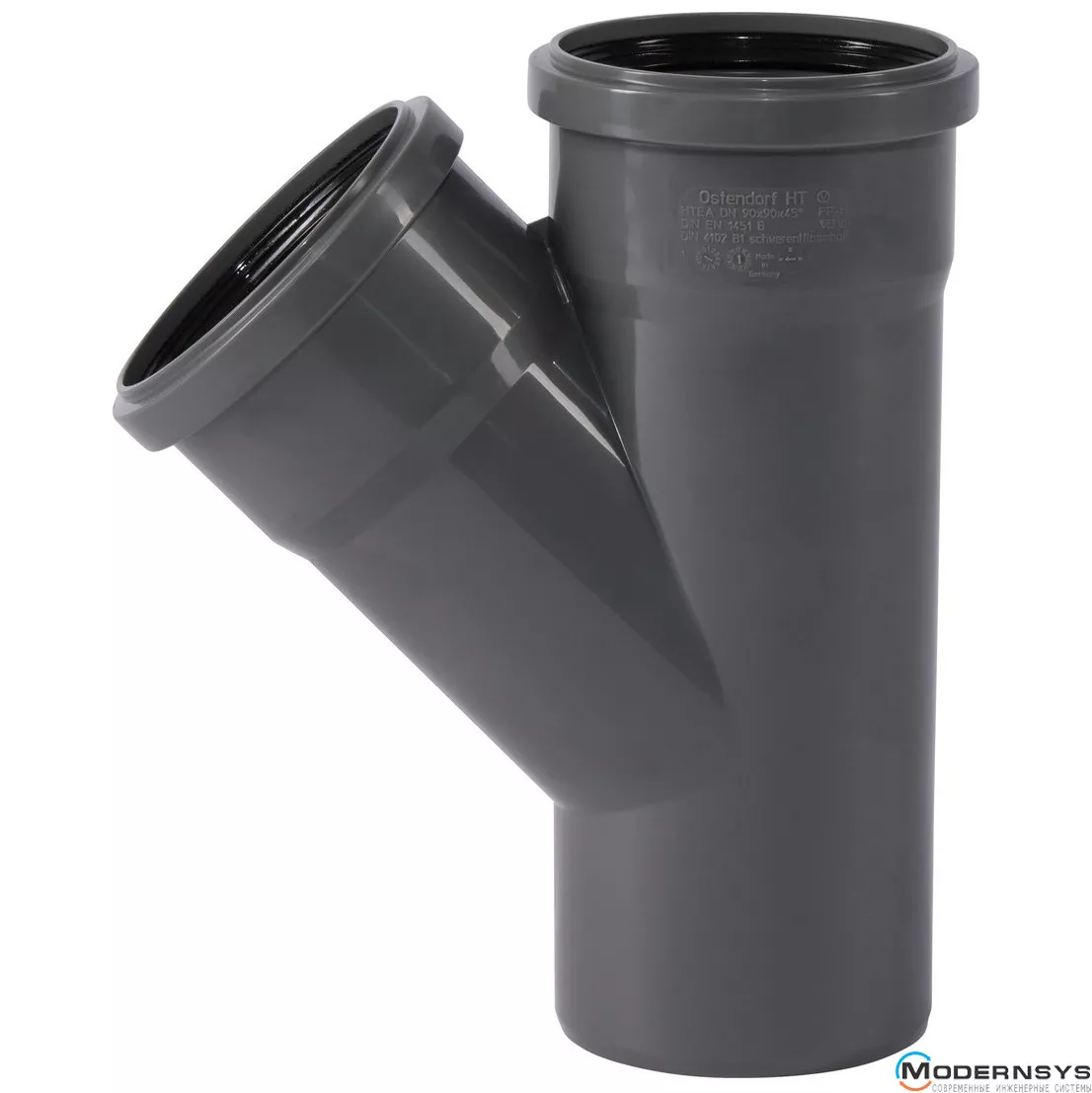 Тройник канализационный Ostendorf HT-Safe 125/125*45˚, Вид канализации: Внутренняя, Тип канализации: Простая, Градус (град.): 45, Модификация: 125/125х45, Цвет: Темно-серый, Диаметр (мм): 125, Материал: Полипропилен PPR, фото Тройник канализационный Ostendorf HT-Safe 125/125*45˚