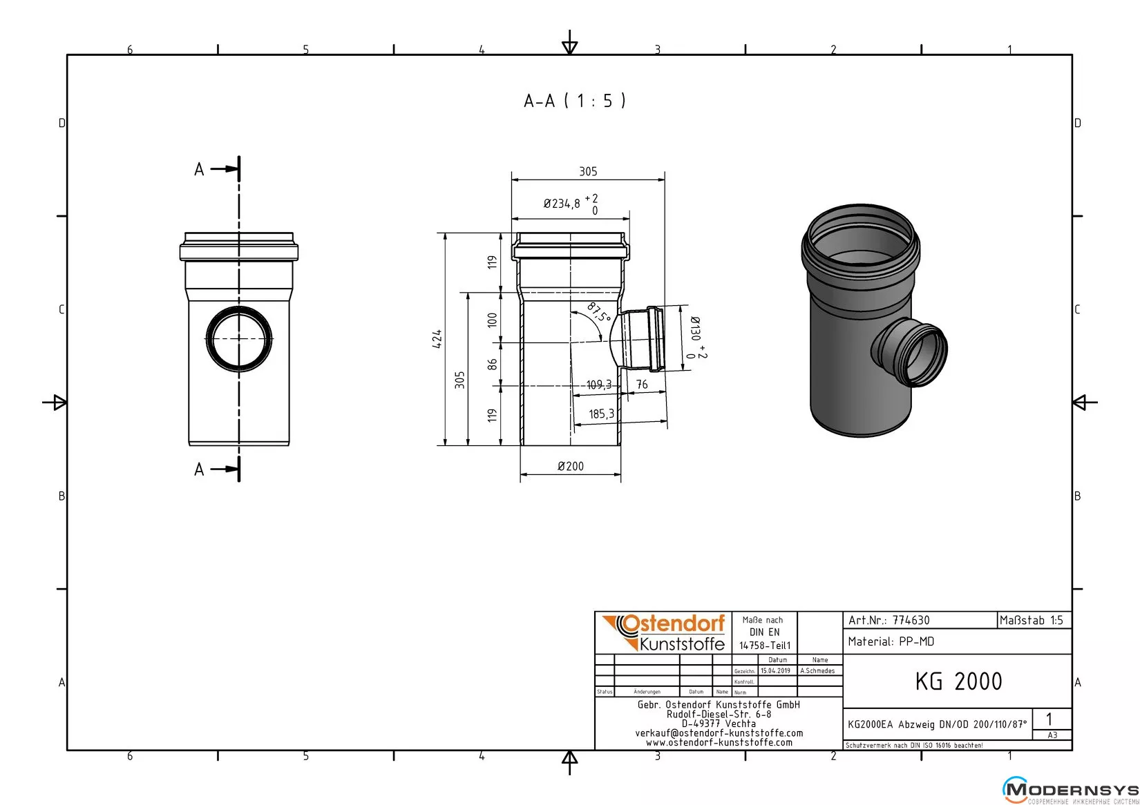 Технические характеристики: Тройник канализационный Ostendorf (Остендорф) KG2000EA 200х110 87°