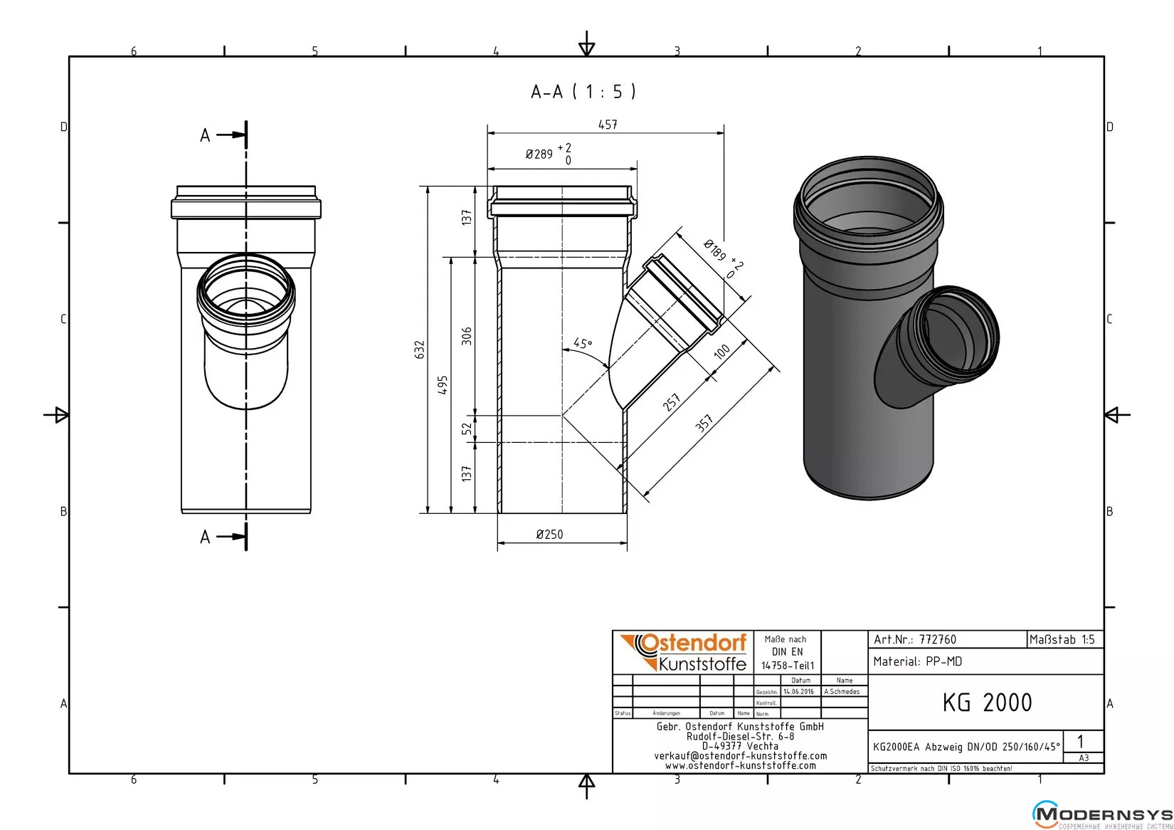 Технические характеристики: Тройник канализационный Ostendorf (Остендорф) KG2000EA 250х150 45°