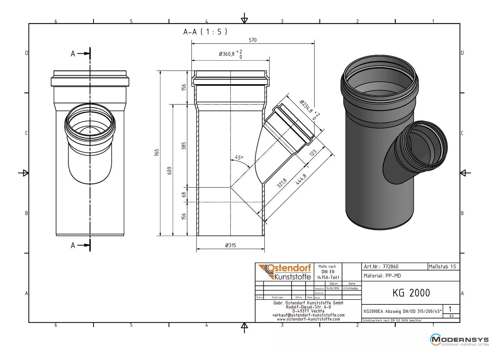 Технические характеристики: Тройник канализационный Ostendorf (Остендорф) KG2000EA 315х200 45°