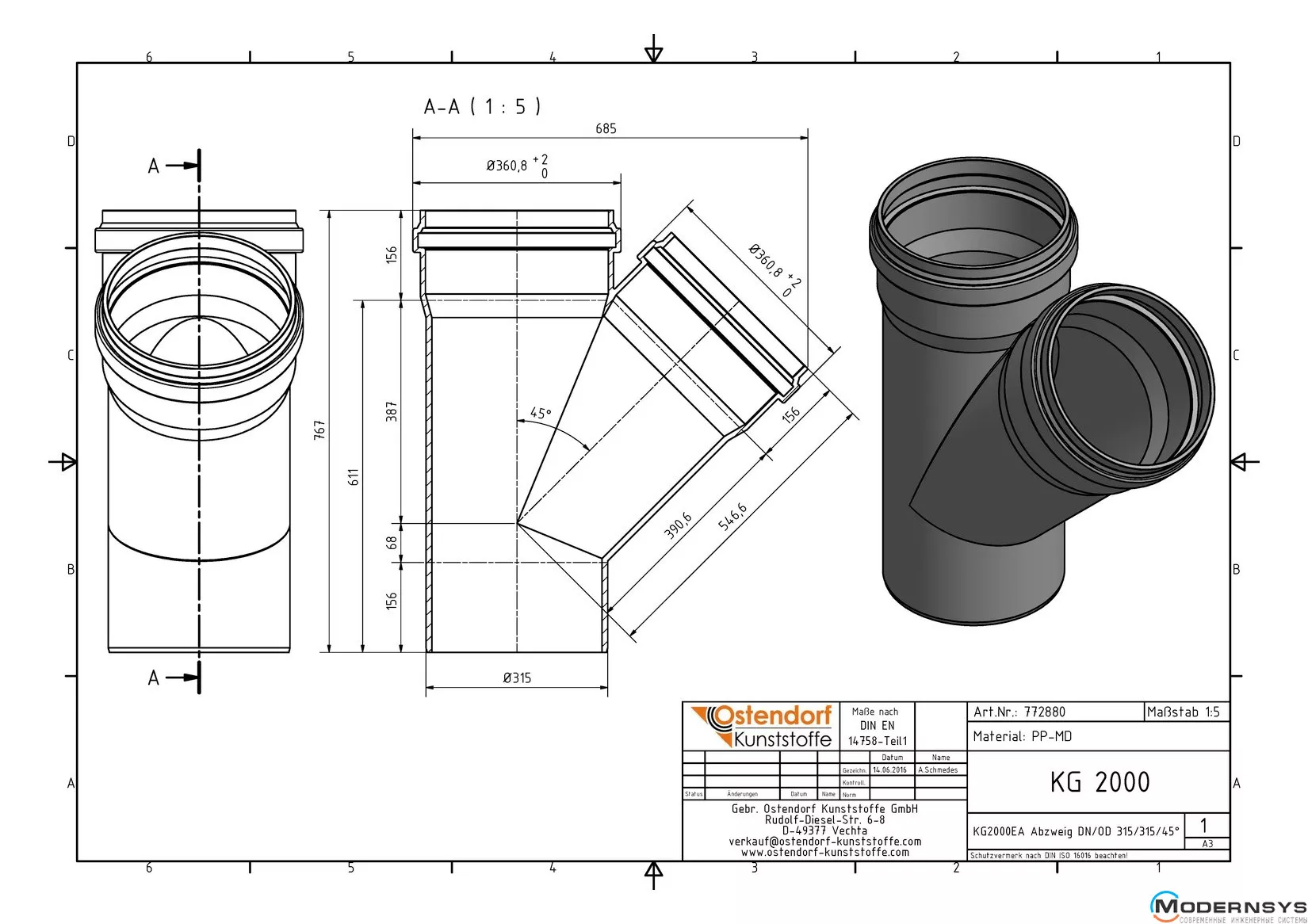 Технические характеристики: Тройник канализационный Ostendorf (Остендорф) KG2000EA 315х315 45°