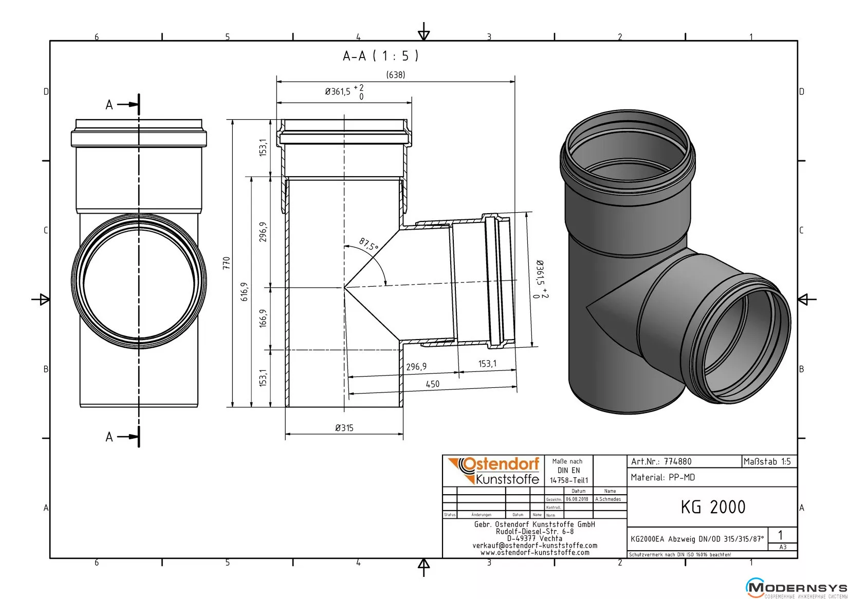 Технические характеристики: Тройник канализационный Ostendorf (Остендорф) KG2000EA 315х315 87°