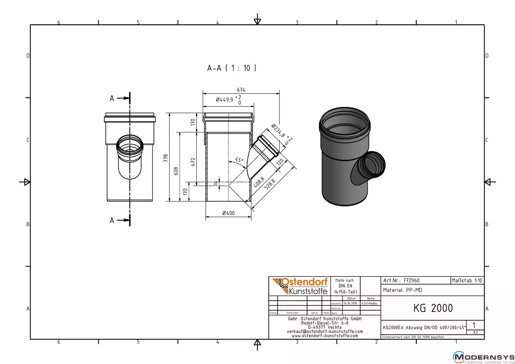 Технические характеристики: Тройник канализационный Ostendorf (Остендорф) KG2000EA 400х200 45°