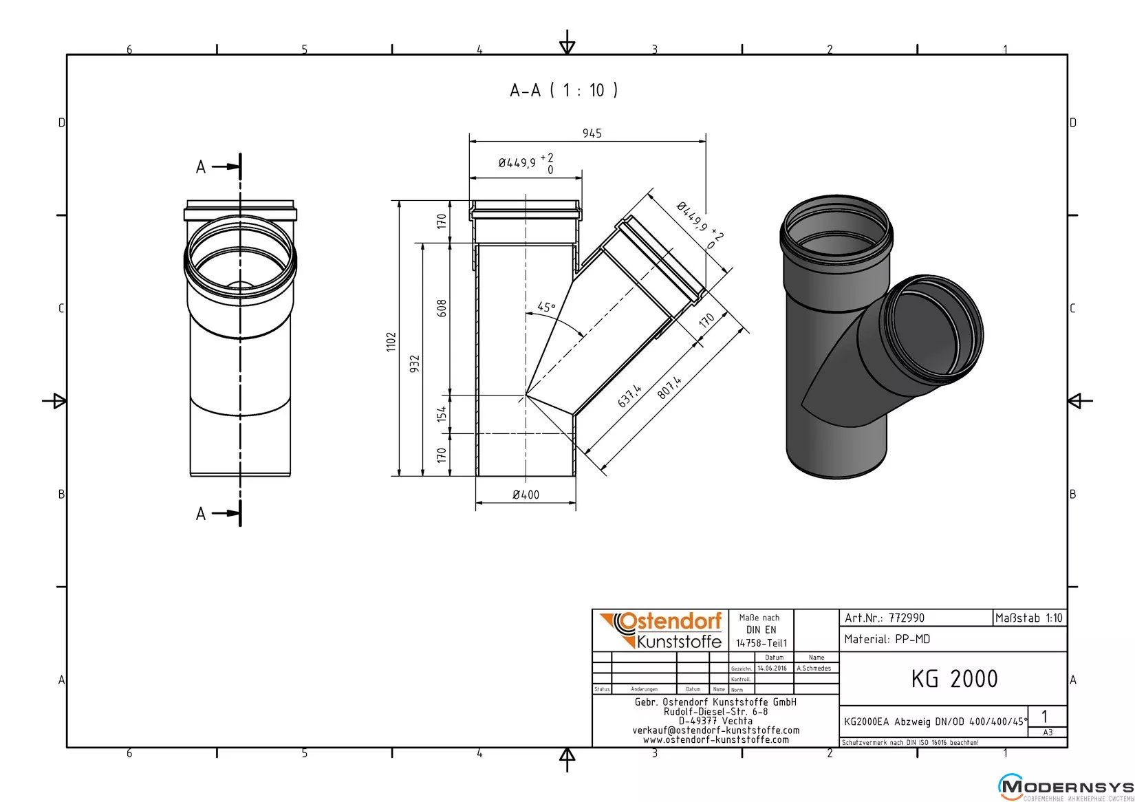 Технические характеристики: Тройник канализационный Ostendorf (Остендорф) KG2000EA 400х400 45°