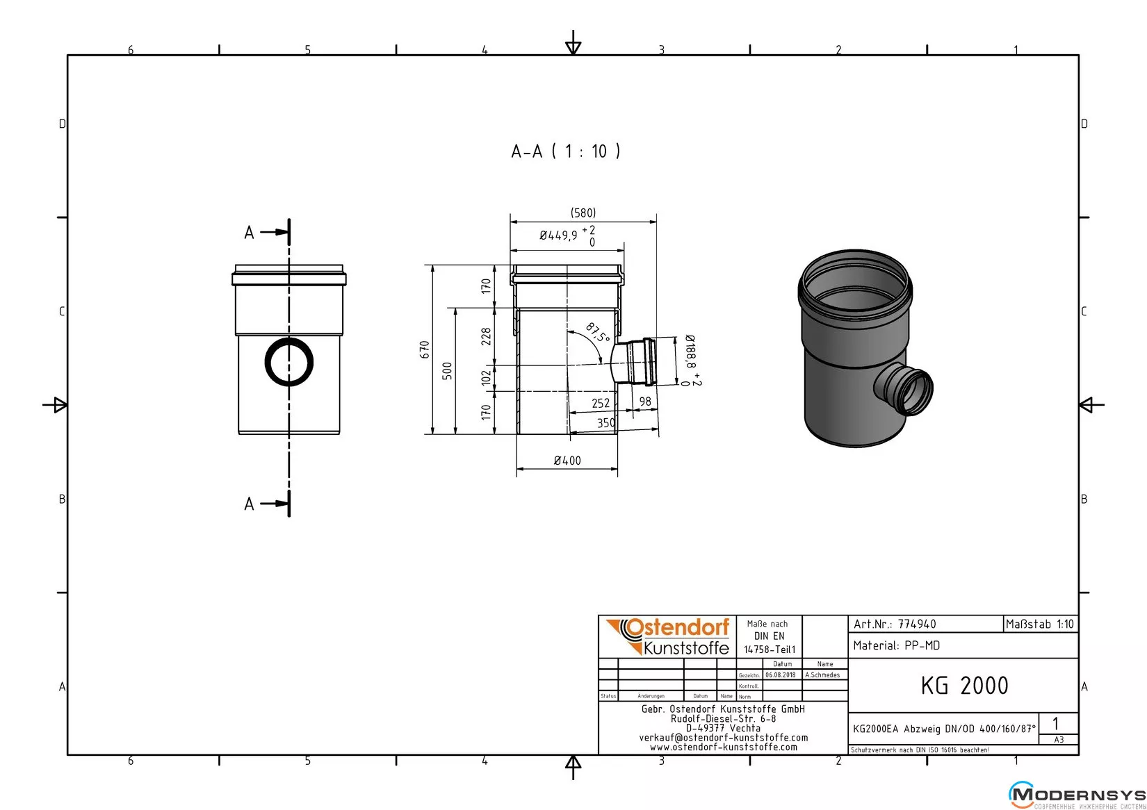 Технические характеристики: Тройник канализационный Ostendorf (Остендорф) KG2000EA 400х150 87°