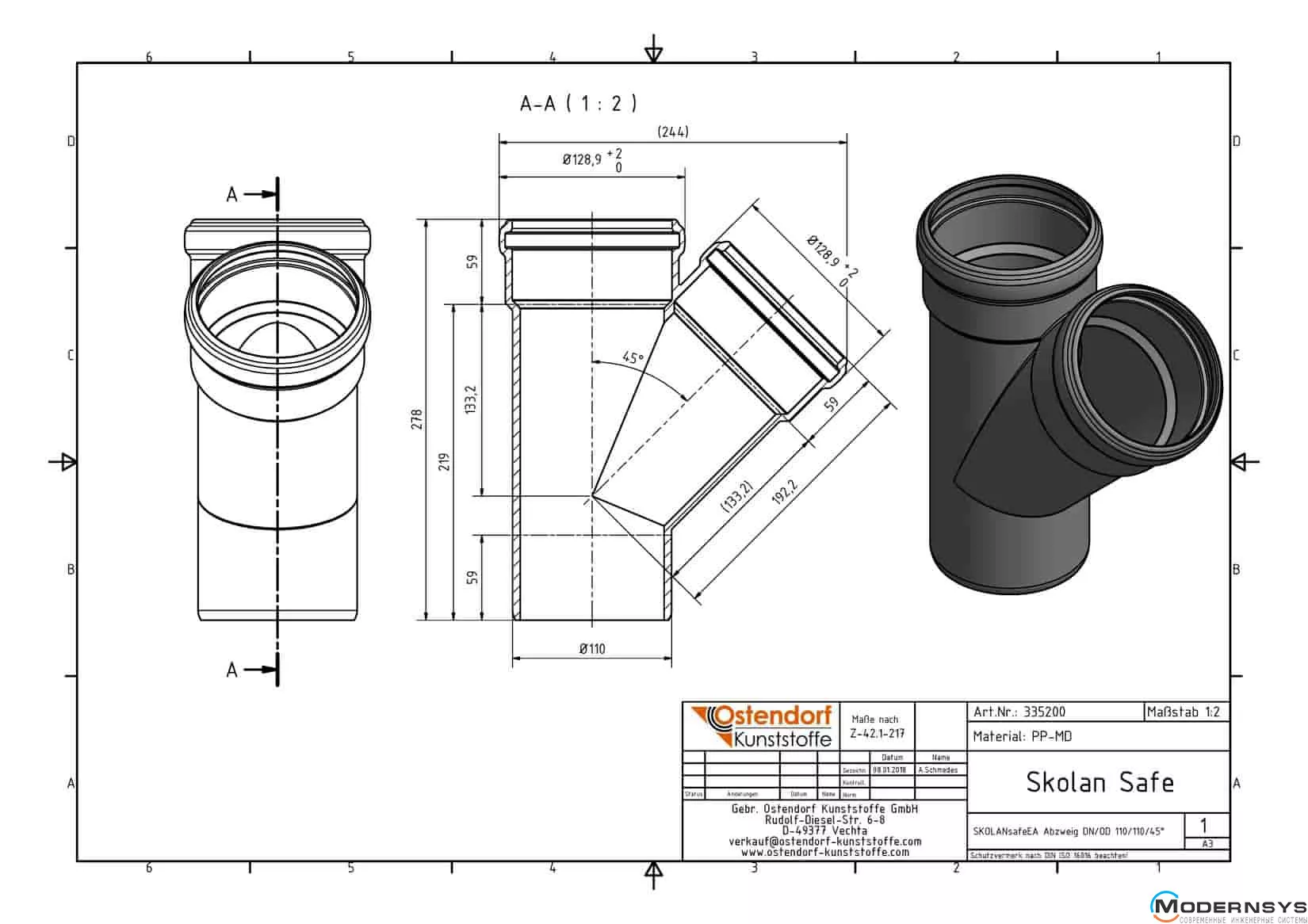 Технические характеристики: Тройник Ostendorf (Остендорф) Skolan db 100/100х45 (335200)