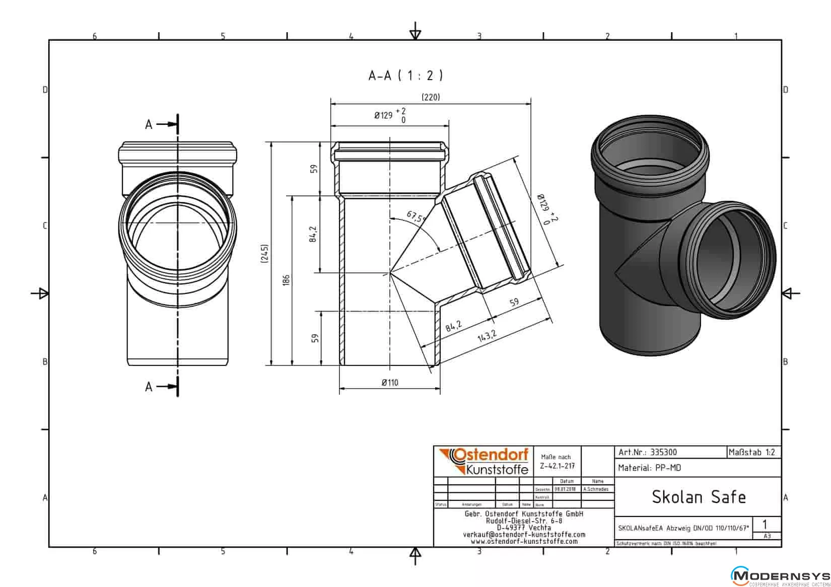 Технические характеристики: Тройник Ostendorf (Остендорф) Skolan db 100/100х67 (335300)