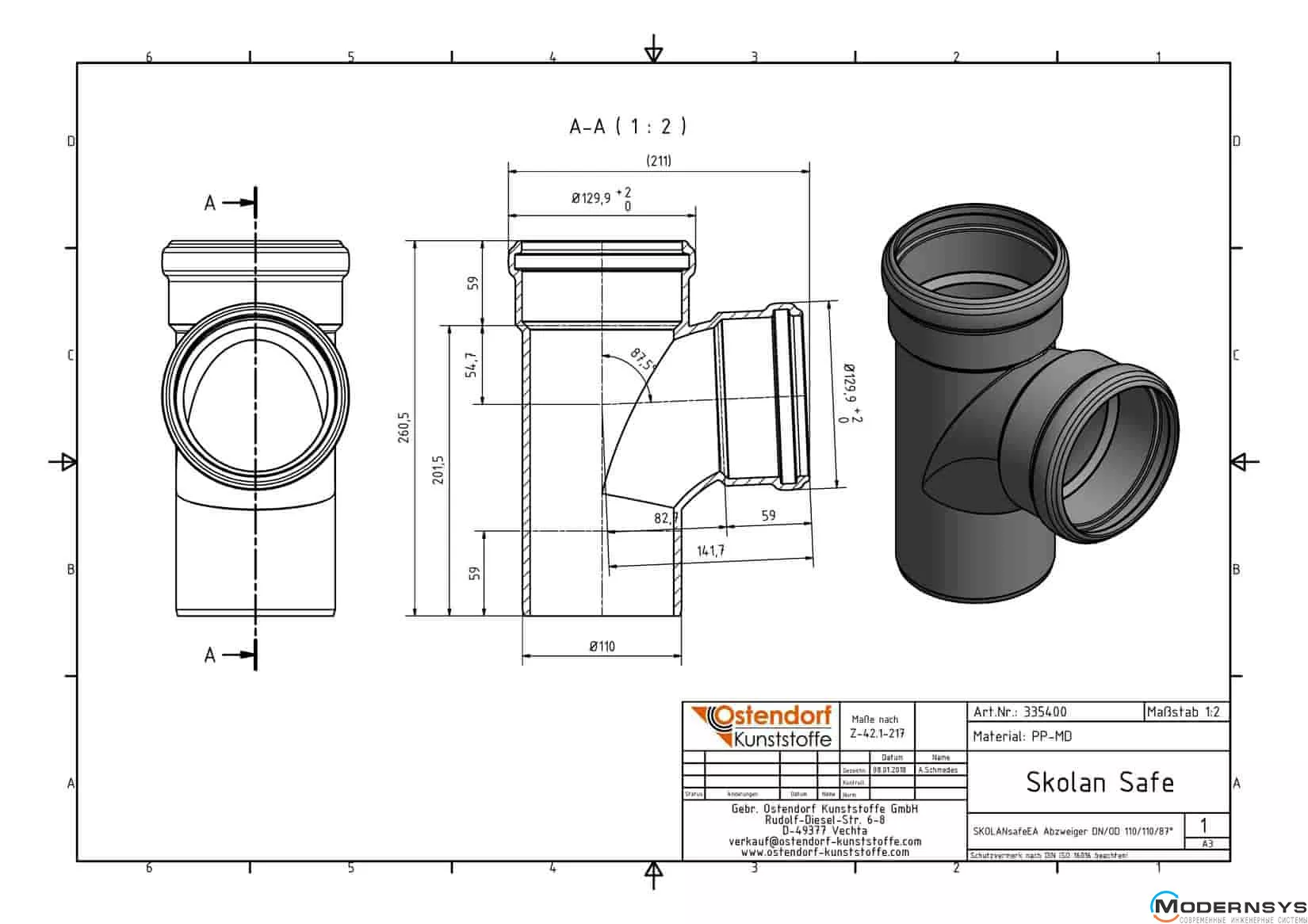 Технические характеристики: Тройник Ostendorf (Остендорф) Skolan db 100/100х87 (335400)