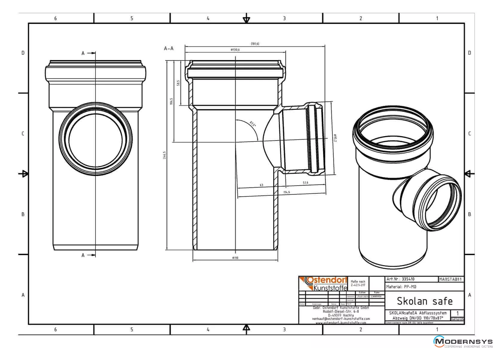 Технические характеристики: Тройник Ostendorf (Остендорф) Skolan db 100/70х87 (335410)