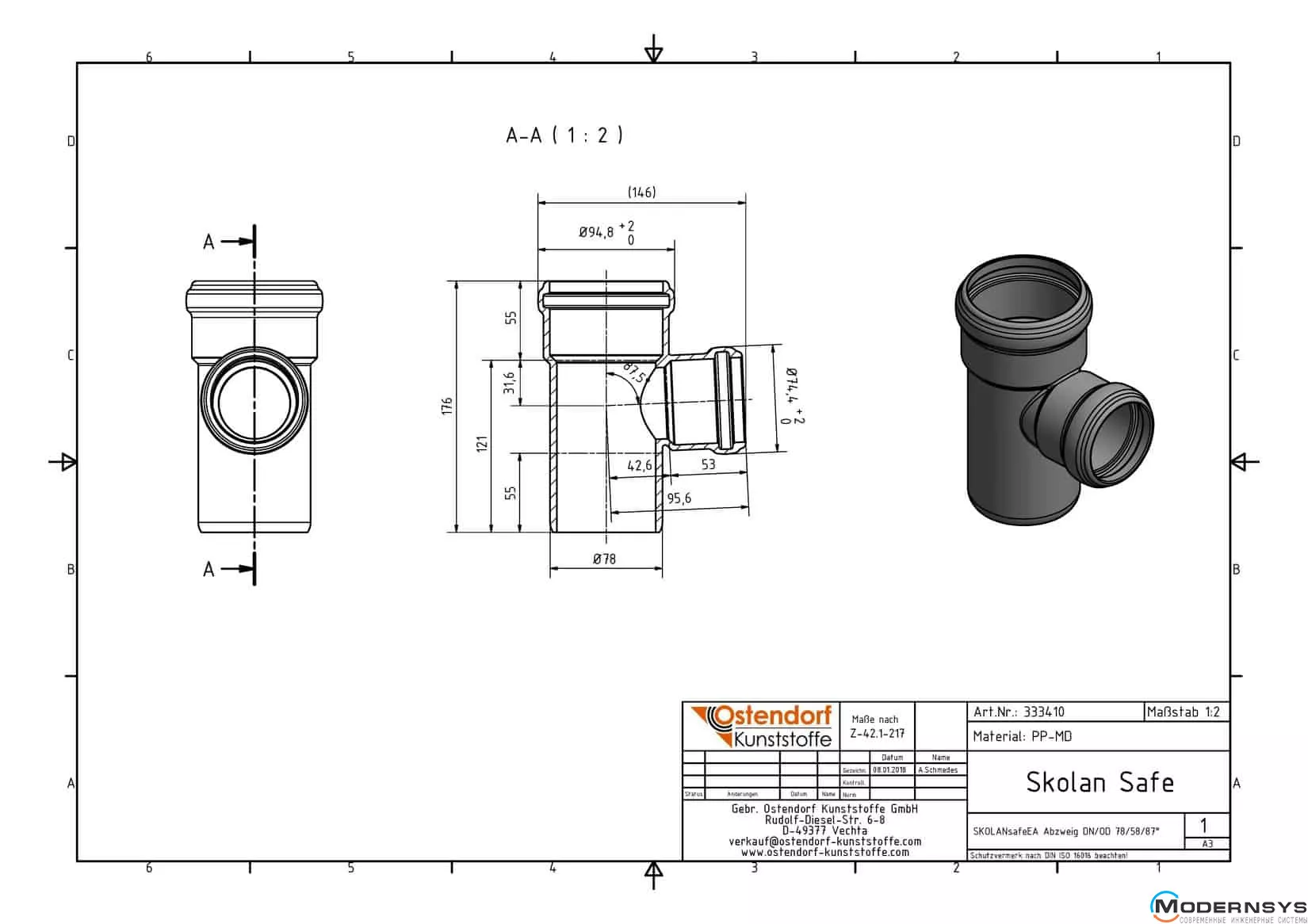 Технические характеристики: Тройник Ostendorf (Остендорф) Skolan db 70/50х87 (333410)