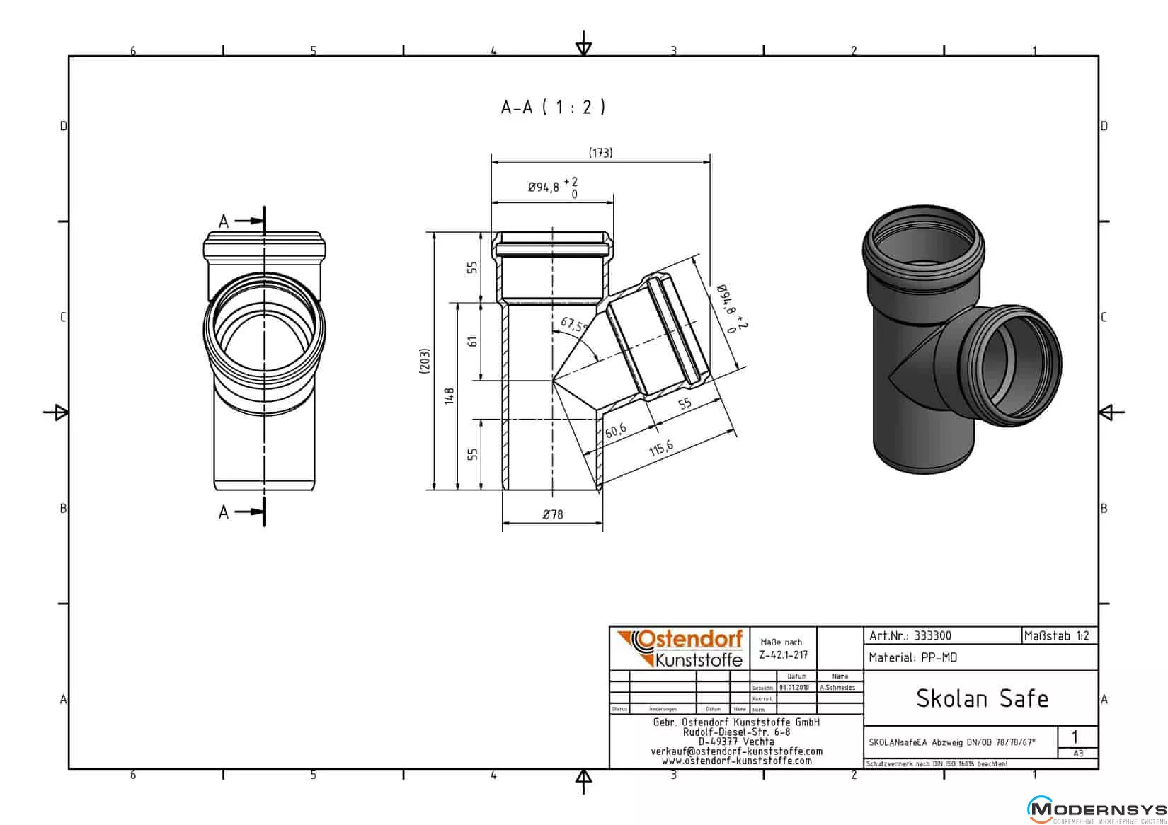 Технические характеристики: Тройник Ostendorf (Остендорф) Skolan db 70/70х67 (333300)