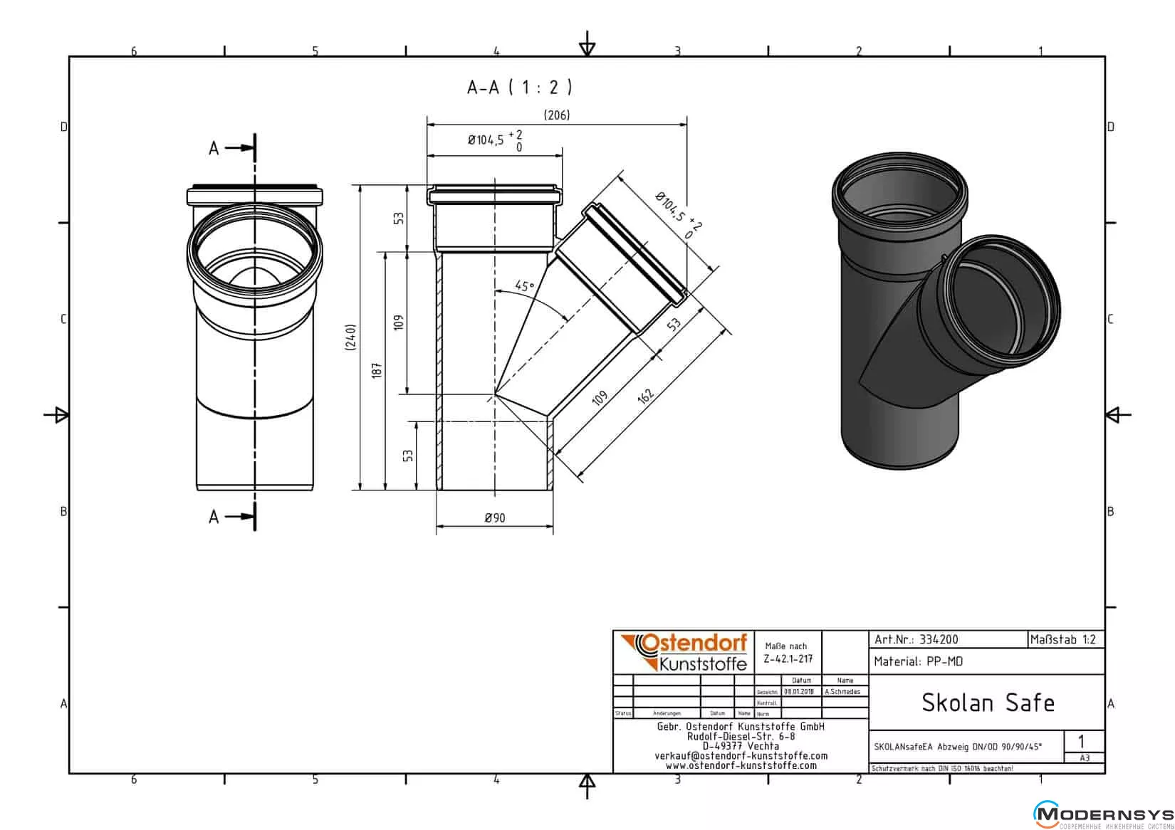 Технические характеристики: Тройник Ostendorf (Остендорф) Skolan db 90/90х45 (334200)