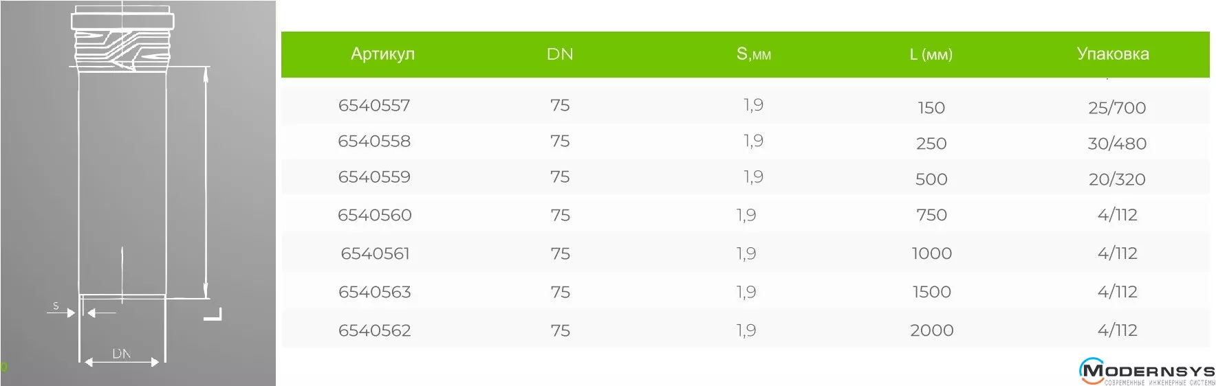 Технические характеристики: Труба канализационная ASG (АСГ) HTR 75x250
