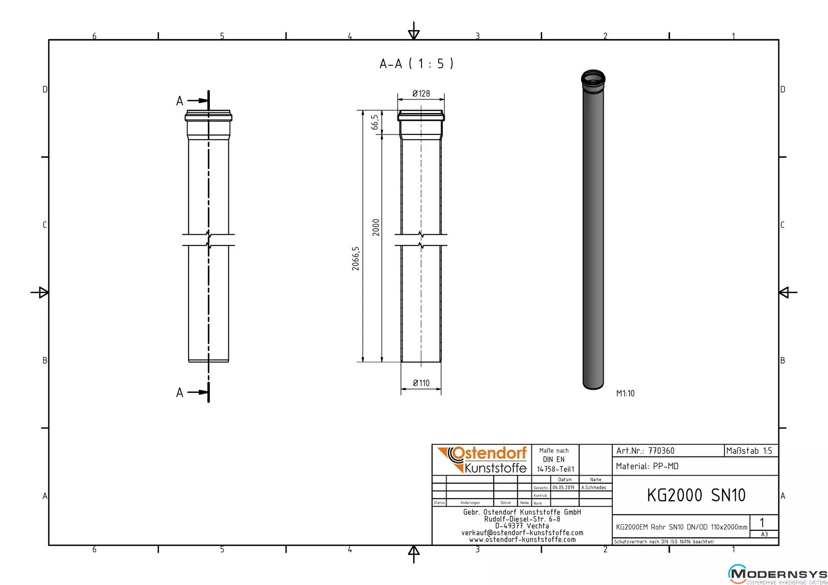Технические характеристики: Труба канализационная Ostendorf (Остендорф) KG2000EM 110х2000 мм
