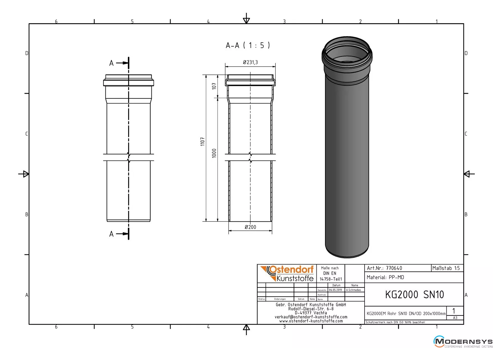 Технические характеристики: Труба канализационная Ostendorf (Остендорф) KG2000EM 200х1000 мм