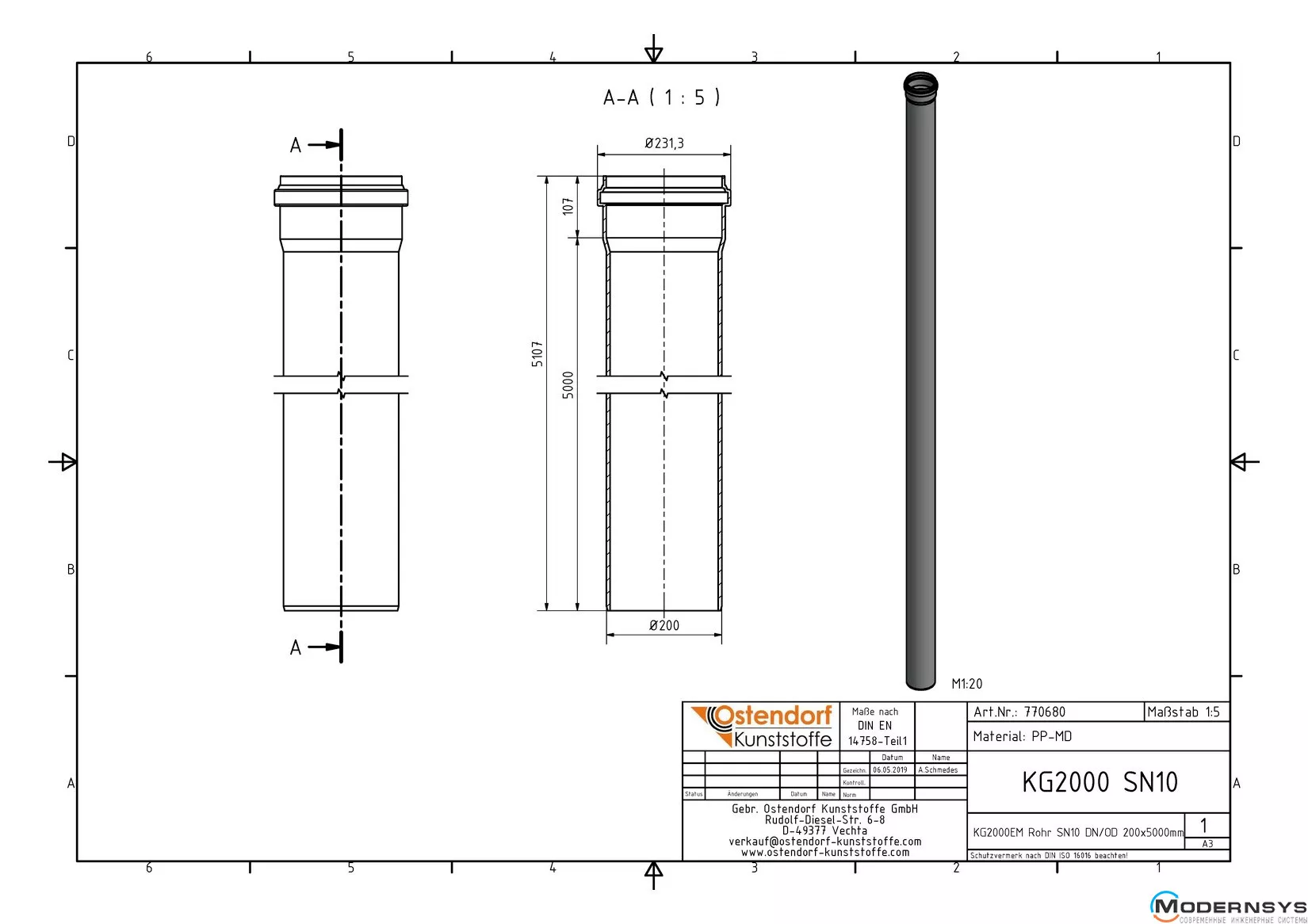 Технические характеристики: Труба канализационная Ostendorf (Остендорф) KG2000EM 200х5000 мм