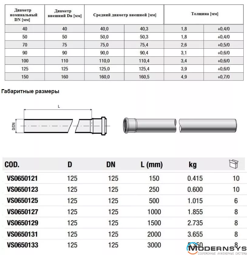 Технические характеристики: Труба канализационная Valsir (Валсир) Triplus Ø125 L=1000 мм