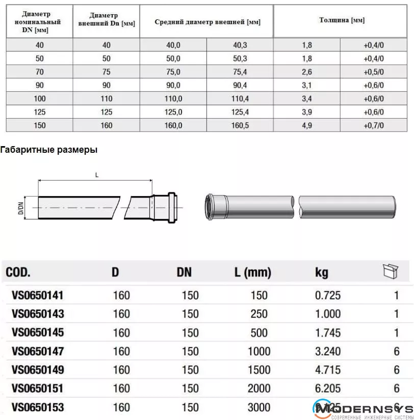 Технические характеристики: Труба канализационная Valsir (Валсир) Triplus Ø160 L=1000 мм