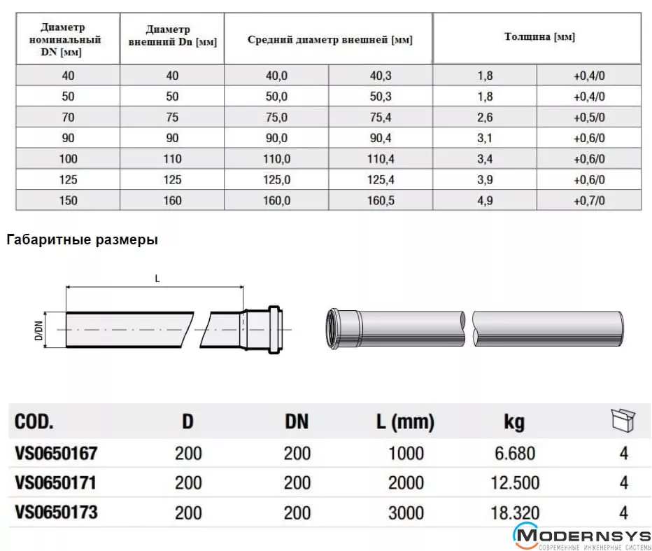 Технические характеристики: Труба канализационная Valsir (Валсир) Triplus Ø200 L=1000 мм
