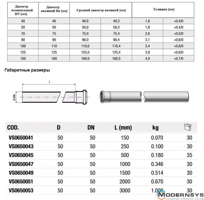 Технические характеристики: Труба канализационная Valsir (Валсир) Triplus Ø50 L=150 мм