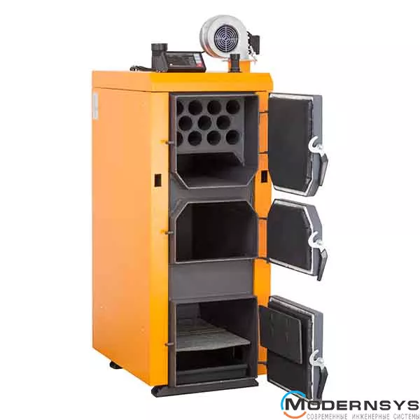 - Верхняя дверь котла открывает доступ к теплообменнику, отличительной особенностью котла является его конструкция. В отличие от котлов конкурентов, теплообменник котла выполнен из нескольких рядов высококачественных жаровых труб, что несомненно повышает его КПД, за счет увеличения общей площади теплового съема. Топочная камера котла выполнена из жаропрочной котловой стали, толщиной 5 мм в котлах мощностью от 10 до 24 кВт и 6мм от 40 до 96 кВт.