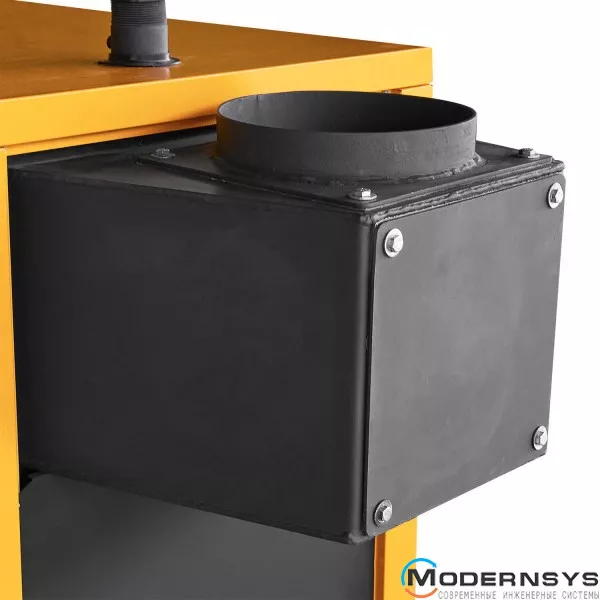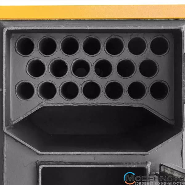 - Верхняя дверь котла открывает доступ к теплообменнику, отличительной особенностью котла является его конструкция. В отличие от котлов конкурентов, теплообменник котла выполнен из нескольких рядов высококачественных жаровых труб, что несомненно повышает его КПД, за счет увеличения общей площади теплового съема. Топочная камера котла выполнена из жаропрочной котловой стали, толщиной 5 мм в котлах мощностью от 10 до 24 кВт и 6мм от 40 до 96 кВт.