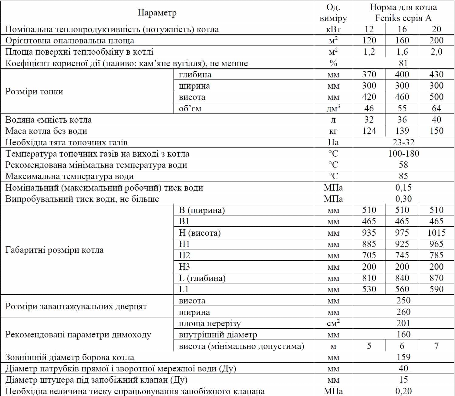 Технические характеристики: Твердотопливный котел Feniks (Феникс) серия A 16 кВт с автоматикой и вентилятором