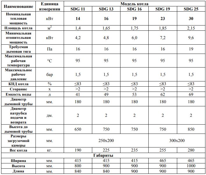 Технические характеристики для твердотопливных котлов Metal-Fach SDG