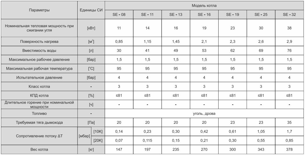 Технические характеристики для твердотопливных котлов Metal-Fach SE