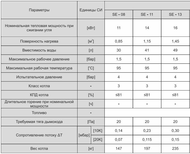 Технические характеристики для твердотопливных котлов Metal-Fach SE