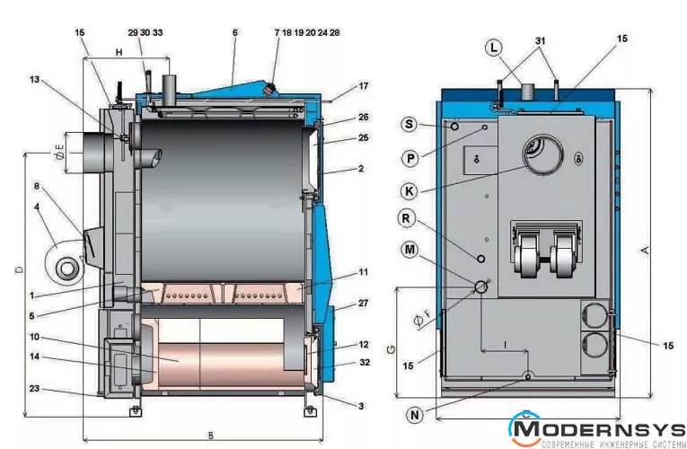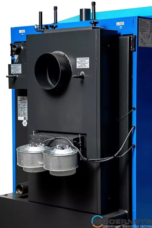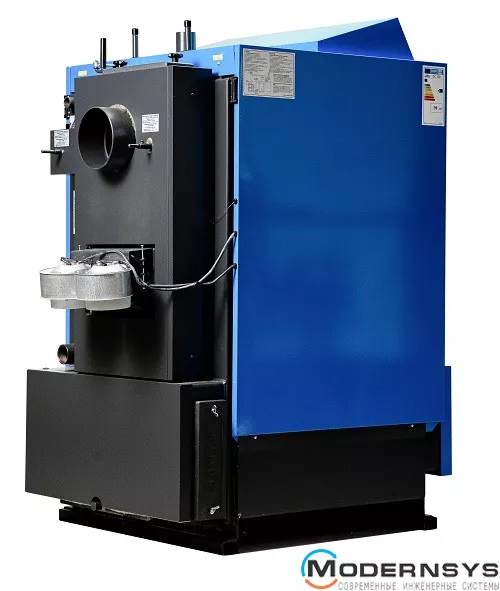 Котел изготовлен из качественной котловой стали и оснащён водяным теплообменником, обеспечивающим надежную передачу тепла в систему отопления. Управление процессом горения осуществляется с помощью вытяжного вентилятора и электронного регулятора, которые поддерживают оптимальные условия работы котла и повышают комфорт эксплуатации.