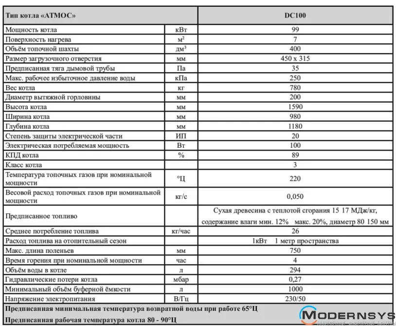 ATMOS DC 100 рассчитан на работу в закрытых системах отопления с максимальным рабочим давлением до 3 бар и максимальной температурой теплоносителя до 90 °C. Загрузка топлива осуществляется вручную через фронтальную загрузочную дверцу. Котел предназначен для сжигания сухих дров и древесных брикетов, что делает его эффективным решением для автономного отопления объектов большой площади.