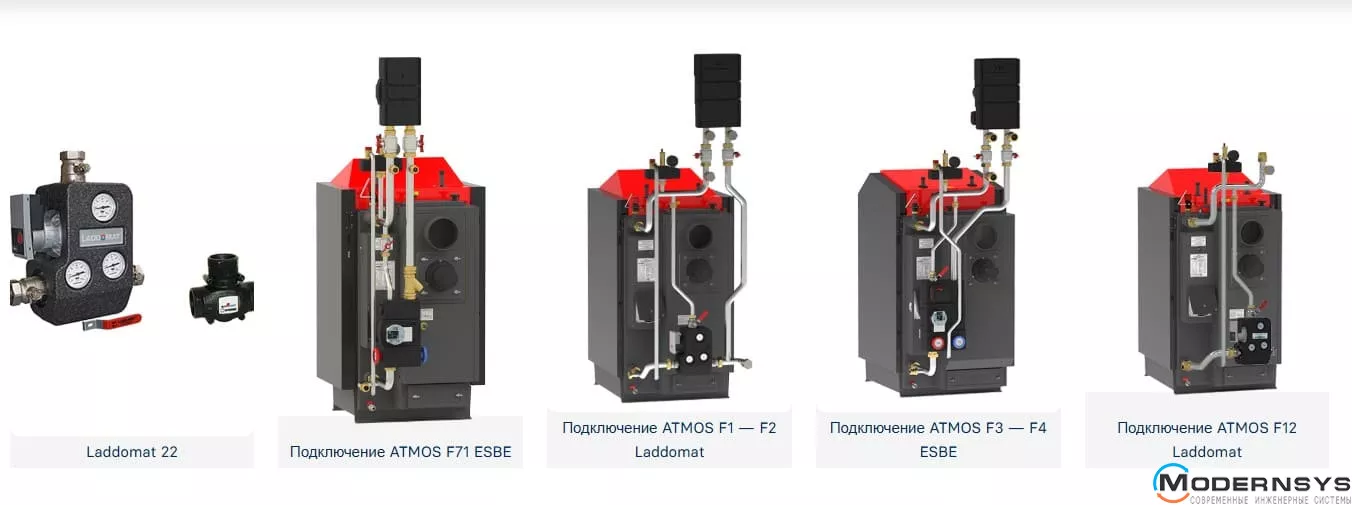 При монтаже рекомендуется использовать оригинальный комплект подключения ATMOS, например, F71 ESBE, F1 — F4, F12 Laddomat, F21 — F22 (только контур котла) или F31 и F32 AKU в случае подключения к накопительным бакам. После котла ATMOS необходимо создать так называемый котловой контур, содержащий LADDOMAT 22 или термостатический клапан (для электронного контроллера ACD 03/04 – трехходовой клапан, управляемый серводвигателем), с минимальной температурой обратной воды в котле. 65 °С. Температуру воды на выходе из котла необходимо постоянно поддерживать в пределах 80 – 90 °С, а на смесительном трехходовом кране выставляем температуру воды на радиаторы или теплый пол по мере необходимости (напр. 30 – 80 °С). Все котлы в стандартной комплектации поставляются с контуром охлаждения для защиты от перегрева. Установите котлы с накопительными баками, чтобы снизить расход топлива и повысить комфорт отопления.