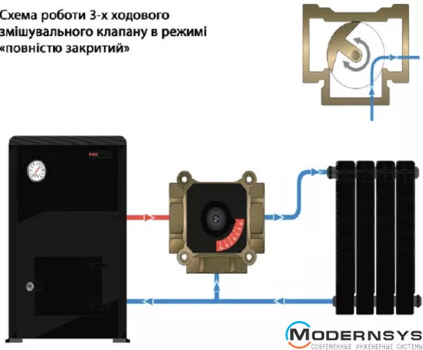 Необхідна температура в системі досягається за допомогою додавання необхідної кількості рідини, що надходить із зворотного трубопроводу, і подається в котл.