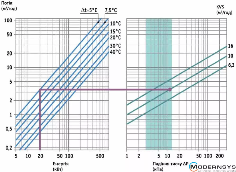 Кожен клапан має свою пропускну здатність (Kvs), знаючи яку можна визначити, якого саме розміру клапан необхідний для вашої системи. Діапазон втрати тиску повинен бути в межах 3 15 кПа (0,03 0,15 бар). ;Якщо в цей діапазон перепаду тиску потрапляють два клапани, то вибирають клапан з меншою пропускною здатністю. Для радіаторних систем опалення зазвичай використовується Δt = 200С, а для систем підлогового опалення Δt = 50С. При додаванні гліколю в теплоносій (воду) збільшується в'язкість і змінюється теплоємність даного теплоносія, що теж необхідно враховувати при виборі клапана. Якщо вміст гліколю 30-50%, слід вибрати клапан з великим (на один рівень) Kvs. Нижчий вміст гліколю не впливає на роботу клапана.