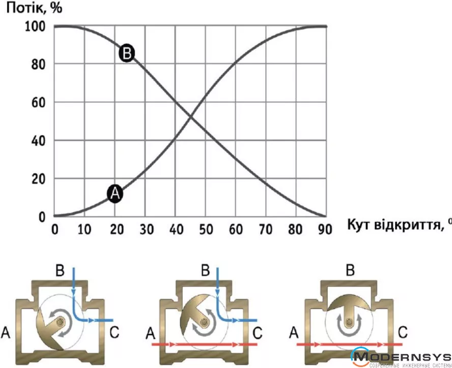 Поворотні змішувальні 3-х ходові клапани призначені для регулювання витрати теплоносія в системах опалення та охолодження (опалення з використанням радіаторів, водяної теплої підлоги та інші системи).
