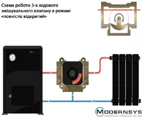 Необхідна температура в системі досягається за допомогою додавання необхідної кількості рідини, що надходить із зворотного трубопроводу, і подається в котл.