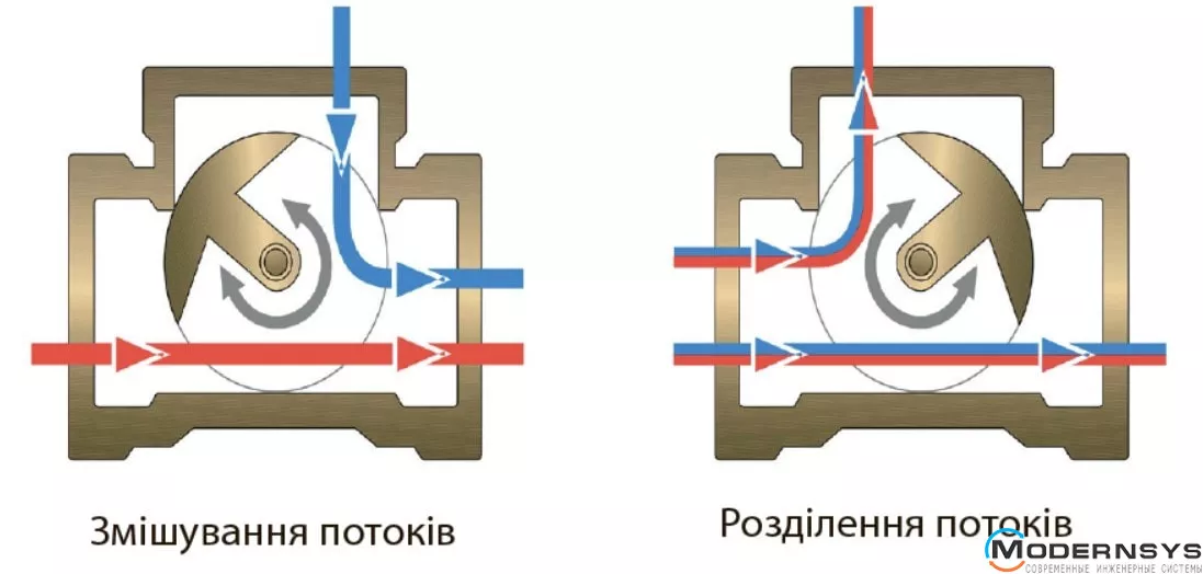 Триходовий клапан може виконувати функції змішування або розділення потоків. При повороті заслінки в один бік буде поступово відкриватися прохід для теплої рідини і рівною мірою закриватиметься прохід для холодної (зворотний потік від нагрівача). Це підвищує температуру змішаної робочої рідини ( потоку до нагрівача) при майже постійній швидкості потоку, відповідно при повороті заслінки в інший бік, прохід для теплої рідини буде закриватися, а для холодної (зворотної) відкриватися.